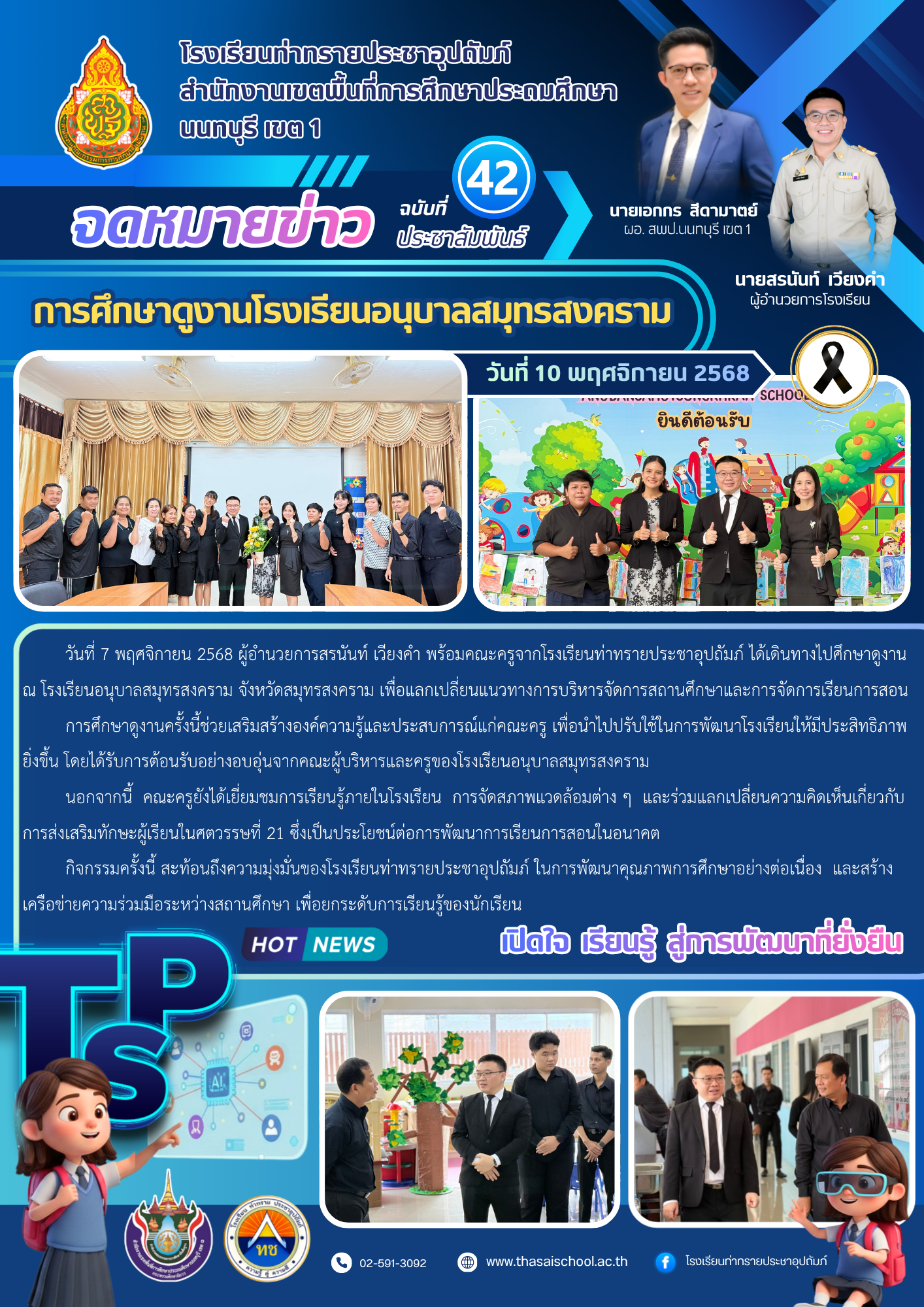 วันที่ 7 พฤศจิกายน 2568 ผู้อำนวยการสรนันท์ เวียงคำ พร้อมคณะครูจากโรงเรียนท่าทรายประชาอุปถัมภ์ ได้เดินทางไปศึกษาดูงาน ณ โรงเรียนอนุบาลสมุทรสงคราม จังหวัดสมุทรสงคราม เพื่อแลกเปลี่ยนแนวทางการบริหารจัดการสถานศึกษาและการจัดการเรียนการสอน