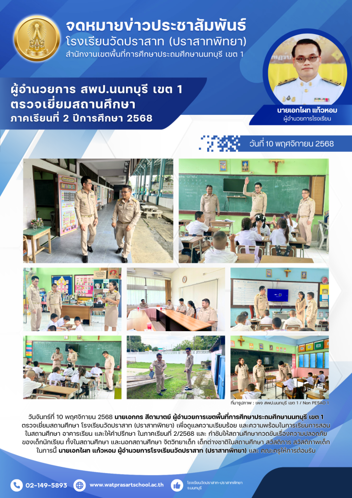 วันจันทร์ที่ 10 พฤศจิกายน 2568 นายเอกกร สีดามาตย์ ผู้อำนวยการเขตพื้นที่การศึกษาประถมศึกษานนทบุรี เขต 1 ตรวจเยี่ยมสถานศึกษา โรงเรียนวัดปราสาท (ปราสาทพิทยา) เพื่อดูแลความเรียบร้อย และความพร้อมในการเรียนการสอนในสถานศึกษา อาคารเรียน และให้คำปรึกษา ในภาคเรียนที่ 2/2568 และ กำชับให้สถานศึกษากวดขันเรื่องความปลอดภัยของเด็กนักเรียน ทั้งในสถานศึกษา และนอกสถานศึกษา จิตวิทยาเด็ก เด็กต่างชาติในสถานศึกษา สวัสดิการ สวัสดิภาพเด็ก ในการนี้ นายเอกไผท แก้วหอม ผู้อำนวยการโรงเรียนวัดปราสาท (ปราสาทพิทยา) และ คณะครูให้การต้อนรับ