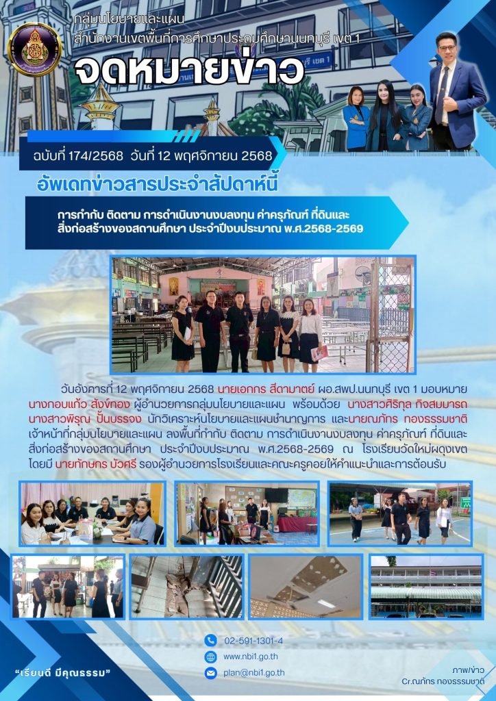 กลุ่มนโยบายและแผนการลงพื้นที่กำกับ ติดตาม การดำเนินงานงบลงทุน ค่าครุภัณฑ์ ที่ดินและสิ่งก่อสร้างของสถานศึกษา ประจำปีงบประมาณ พ.ศ.2568-2569 ของโรงเรียนอนุบาลบางกรวย (วัดศรีประวัติ)12 พฤศจิกายน 2025ณภัทร ทองธรรมชาติอ่านต่อ