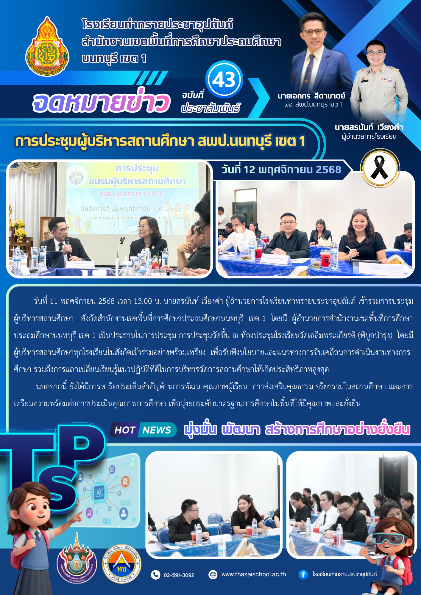วันที่ 11 พฤศจิกายน 2568 เวลา 13.00 น. นายสรนันท์ เวียงคำ ผู้อำนวยการโรงเรียนท่าทรายประชาอุปถัมภ์ เข้าร่วมการประชุมผู้บริหารสถานศึกษา สังกัดสำนักงานเขตพื้นที่การศึกษาประถมศึกษานนทบุรี เขต 1 โดยมีผู้อำนวยการสำนักงานเขตพื้นที่การศึกษาประถมศึกษานนทบุรี เขต 1 เป็นประธานในการประชุม