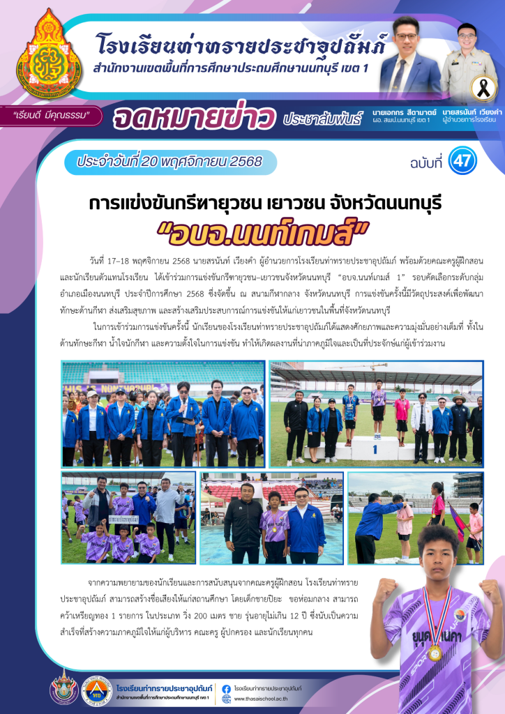 วันที่ 17–18 พฤศจิกายน 2568 นายสรนันท์ เวียงคำ ผู้อำนวยการโรงเรียนท่าทรายประชาอุปถัมภ์ พร้อมด้วยคณะครูผู้ฝึกสอนและนักเรียนตัวแทนโรงเรียน ได้เข้าร่วมการแข่งขันกรีฑายุวชน–เยาวชนจังหวัดนนทบุรี “อบจ.นนท์เกมส์ 1” รอบคัดเลือกระดับกลุ่มอำเภอเมืองนนทบุรี ประจำปีการศึกษา 2568 ซึ่งจัดขึ้น ณ สนามกีฬากลาง จังหวัดนนทบุรี การแข่งขันครั้งนี้มีวัตถุประสงค์เพื่อพัฒนาทักษะด้านกีฬา ส่งเสริมสุขภาพ และสร้างเสริมประสบการณ์การแข่งขันให้แก่เยาวชนในพื้นที่จังหวัดนนทบุรี