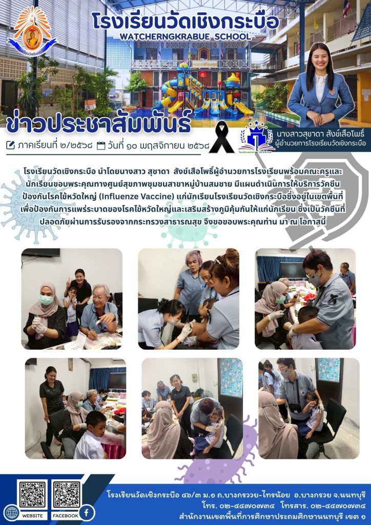 โรงเรียนวัดเชิงกระบือ นำโดยนางสาวสุชาดา สังข์เสือโพธิ์ผู้อำนวยการโรงเรียนพร้อมคณะครูและนักเรียนขอบพระคุรทางศูนย์สุขภาพชุมชนสาขาหมู่บ้านสมชาย มีแผนดำเนินการให้บริการวัคซีนป้องกันโรคไข้หวัดใหญ่ แก่นักเรียนโรงเรียนวัดเชิงกระบือซึ่งเป็นวัคซีนที่ปลอดภัยผ่านการรับรองจากกระทรวงสาธารณสุขจึงขอขอบพระคุณท่าน มา ณ โอกาสนี้