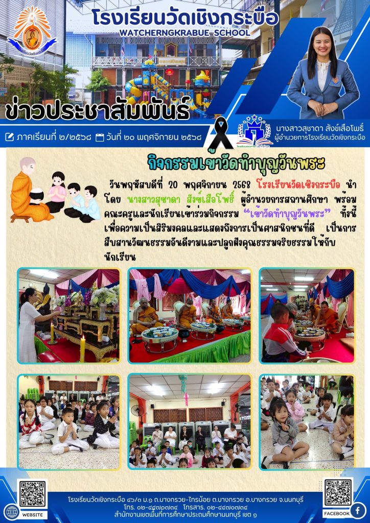 โรงเรียนวัดเชิงกระบือ นำโดยนางสาวสุชาดา สังข์เสือโพธิ์ ผู้อำนวยการสถานศึกษา พร้อมคณะครูและนักเรียนเข้าร่วมกิจกรรม เข้าวัดทำบุญวันพระทั้งนี้เพื่อความเป็นสิริมงคลและแสดงถึงการเป็นศาสนิกชนที่ดี เป็นการสืบสานวัฒนธรรมอันดีงามและปลูกฝังคุณธรรมจริยธรรมให้กับนักเรียน