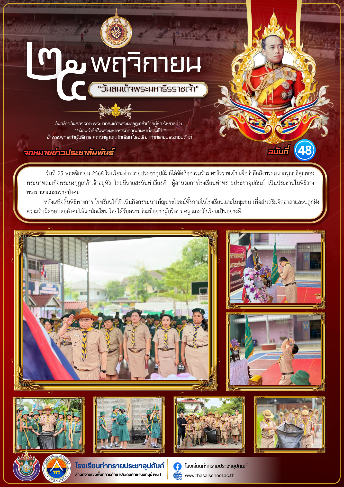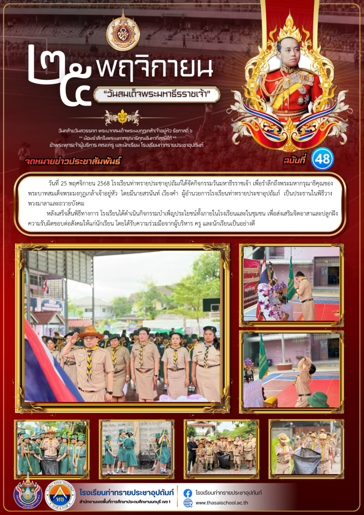 วันที่ 25 พฤศจิกายน 2568 โรงเรียนท่าทรายประชาอุปถัมภ์ได้จัดกิจกรรมวันมหาธีรราชเจ้า เพื่อรำลึกถึงพระมหากรุณาธิคุณของพระบาทสมเด็จพระมงกุฎเกล้าเจ้าอยู่หัว โดยมีนายสรนันท์ เวียงคำ ผู้อำนวยการโรงเรียนท่าทรายประชาอุปถัมภ์ เป็นประธานในพิธีวางพวงมาลาและถวายบังคม
