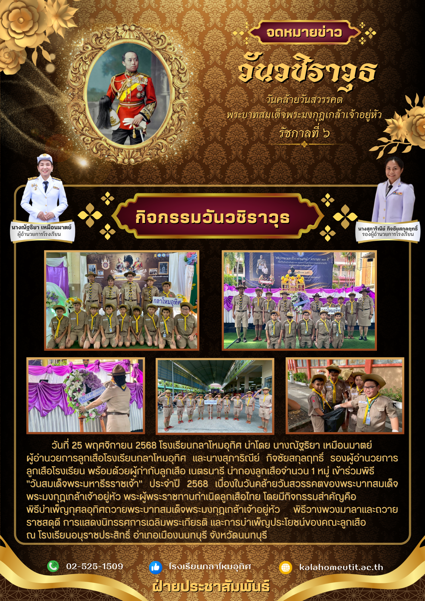 โรงเรียนกลาโหมอุทิศ นำโดย นางณัฐธิยา เหมือนมาตย์ ผู้อำนวยการลูกเสือโรงเรียนกลาโหมอุทิศ และนางสุภาริณีย์ กิจชัยสกุลฤทธิ์ รองผู้อำนวยการลูกเสือโรงเรียน พร้อมด้วยผู้กำกับลูกเสือ เนตรนารี นำกองลูกเสือจำนวน 1 หมู่ เข้าร่วมพิธี “วันสมเด็จพระมหาธีรราชเจ้า” ประจำปี 2568